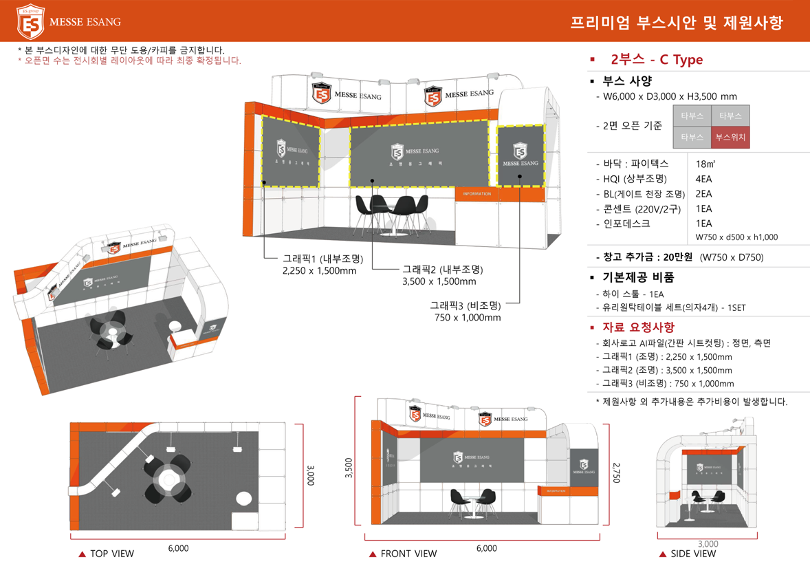 | 시공비 | 3,500,000원 (부스당 1,750,000원) | 4,200,000원 (부스당 2,100,000원) | 4,200,000원 (부스당 2,100,000원) | 4,500,000원 (부스당 2,250,000원) |